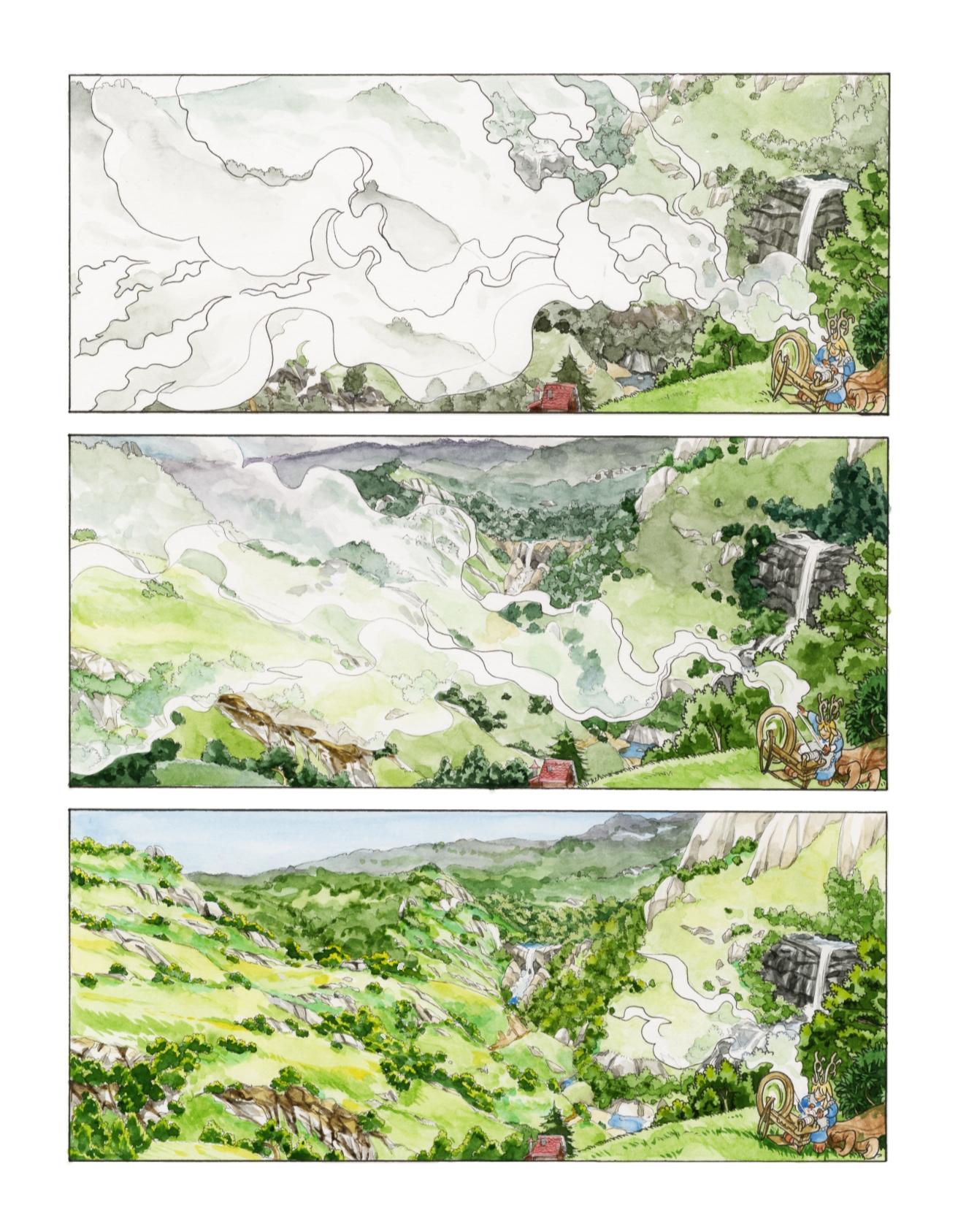 Which brings me to the project in its present state: I am slowly but surely drawing out each of those little thumbnails and turning them into 14″x11″ watercolor paintings. When all is said and done they will be beautiful comic books, able to be read from their pictures alone.